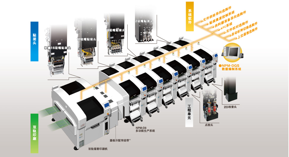 在綜合實(shí)裝生產(chǎn)線實(shí)現(xiàn)高度單位面積生產(chǎn)率貼裝&檢查一連貫的系統(tǒng),實(shí)現(xiàn)高效率和高品質(zhì)生產(chǎn);